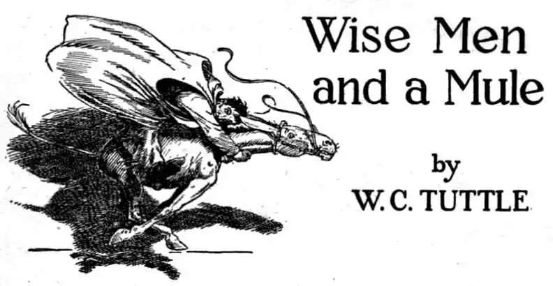 “Look out for that mule!” yelps Magpie, and I looks up at the dim figure of that locoed mule, almost over me. I yanks away from my steer and the steer yanks right with me. Under ordinary conditions I’d ’a’ been able to get away, but I’ve got one leg through a string of them sleigh-bells, and when that steer starts for the door, Ike Harper E-squire went right along—on the back of his neck.