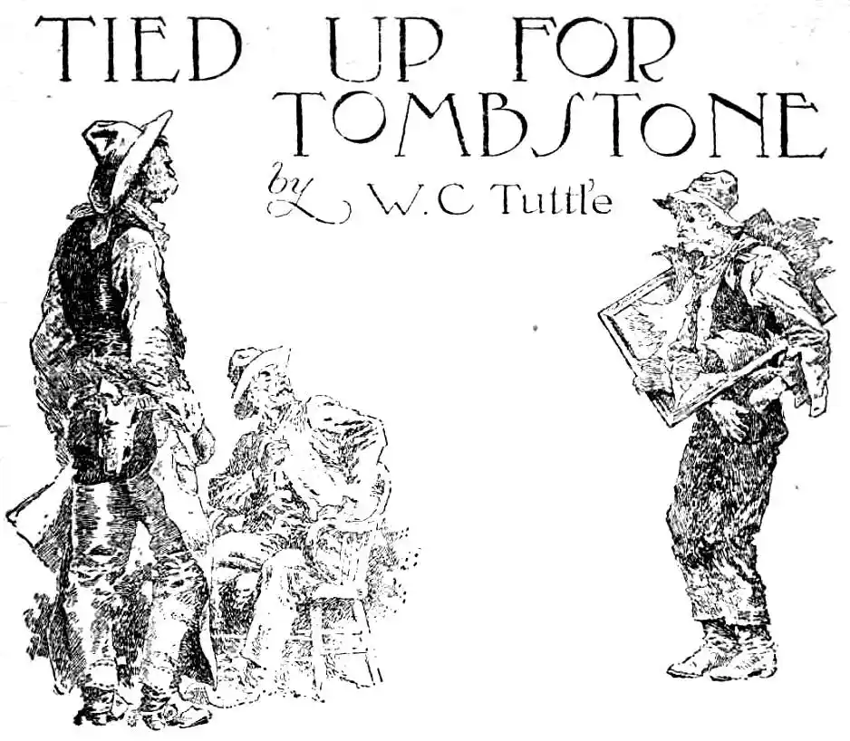 “I got that obituary all fixed up left-handed, and she’s cached under a soap-box behind the printing machine. Don’t jiggle it ’cause she’s fragile as ——! I left that page just like she was for the other paper, but I got a place in it what fits this here masterpiece of mine. If Tombstone should make a mistake and hit me yuh won’t need the obituary. Sabe?”