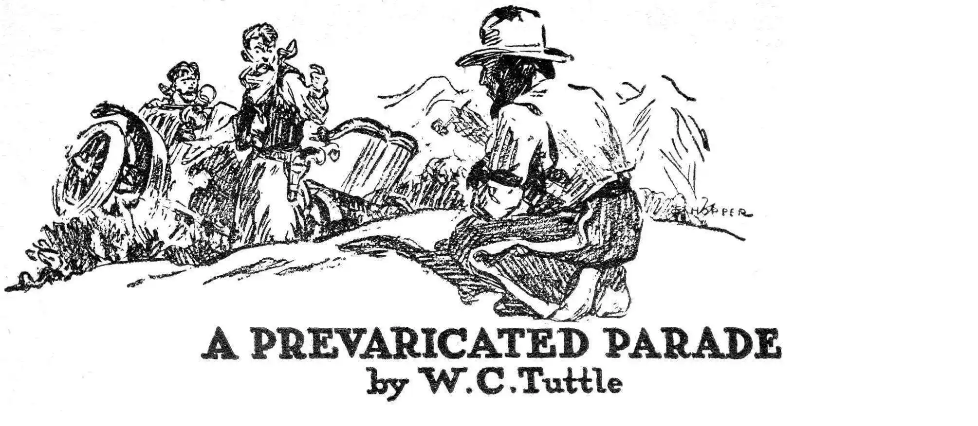 “We got to have a pe-rade,” squeaks Scenery. “Them is necessary adjunct to celebrations. I was down to Cottonwood last Fourth, and they sure had a humdinger of a pe-rade. Had a feller all dressed up in a fancy hat and a sash, riding in front, and then comes a lot of dress-up wagons, what they designates as floats. They has a beautiful gal all dressed up to imitate Miss Columbus, and———”