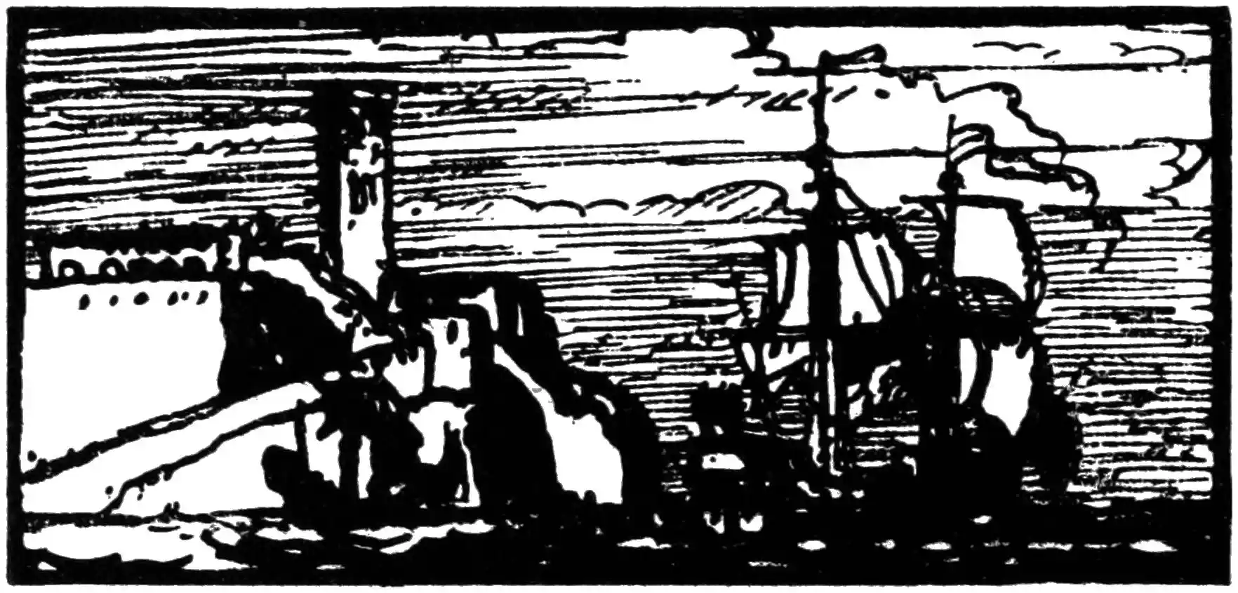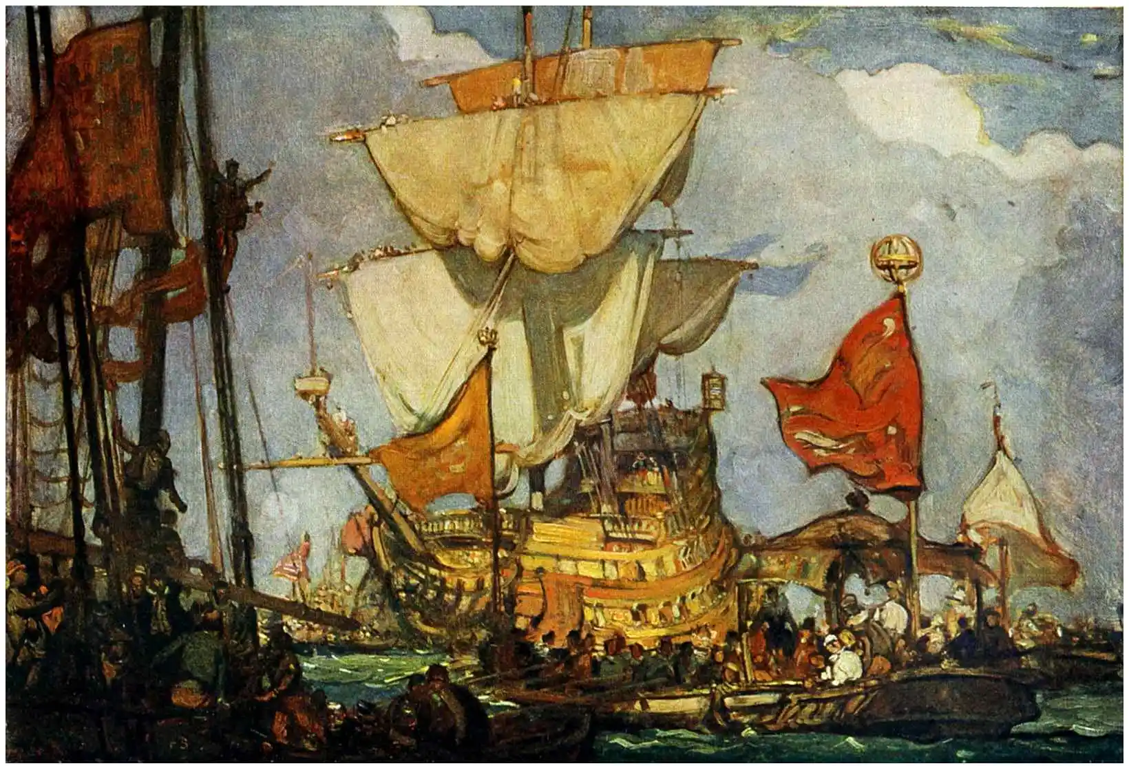 Hand, under the Northern and Southern Pole stars, victor over a hundred enemies, ballasted with royal treasure, & steered by the captured charts of Spanish Admirals, the little ship that sailed as the Pelican, comes home again as the Golden Hind. She brings her fabulous booty and her still more fabulous romance from Plymouth Sound to Deptford, and then and there the great names of the past—the Christophers, the Great Harrys, the Dragons and the Swans—are all finally eclipsed. Drake, kneeling upon her deck, receives his knighthood from the hand of Gloriana, and the Golden Hind herself, bidding farewell for ever to wind and wave, is laid up as a national monument—“consecrated to perpetuall Memory.”