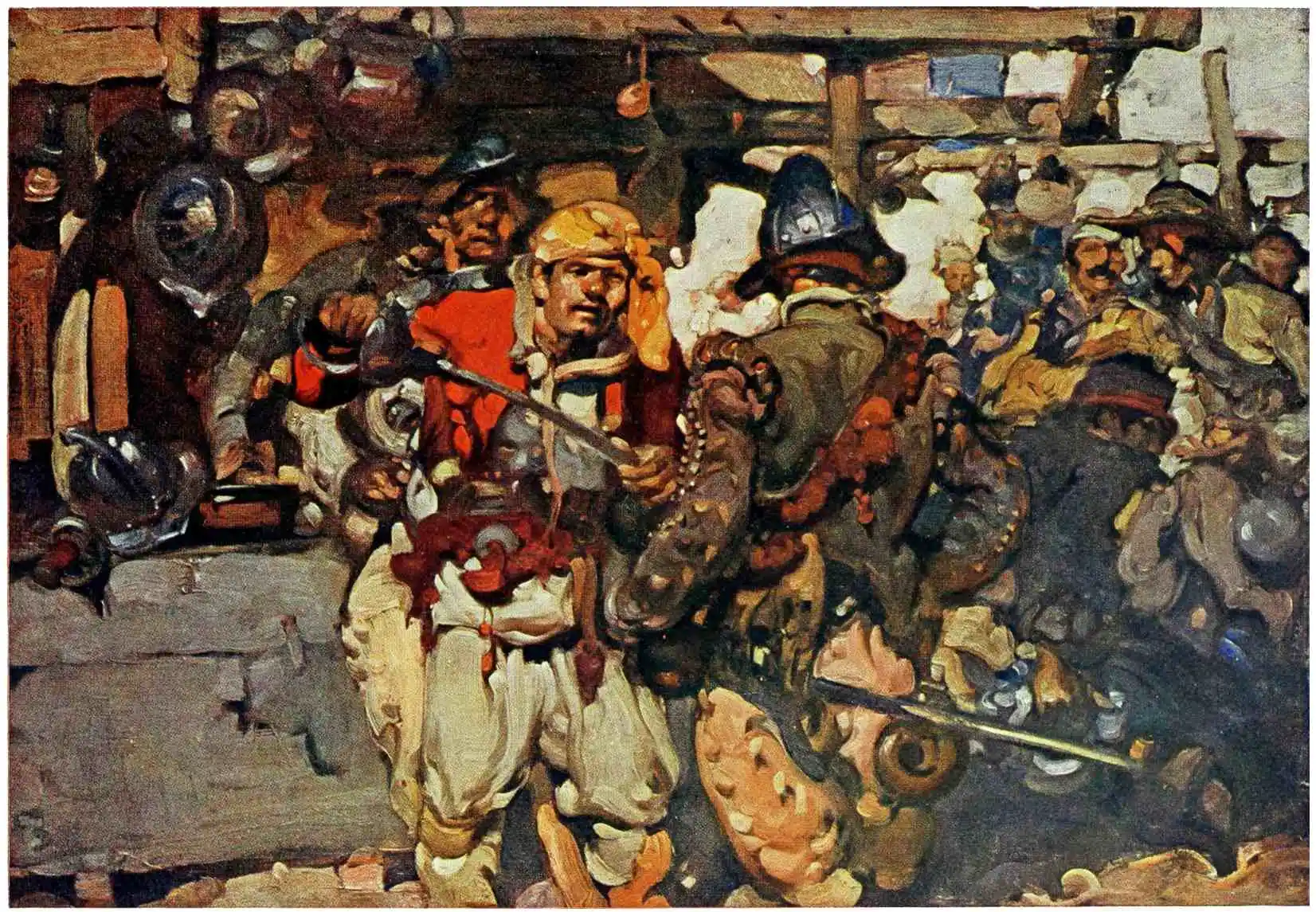 All the powder of the Revenge to the last barrel was now spent, all her pikes broken, forty of her best men slain, and the most part of the rest hurt. In the beginning of the fight she had but one hundred free from sickness, and fourscore and ten sick, laid in hold upon the ballast. A small troop