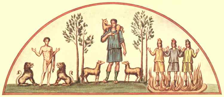 PAINTING IN THE CATACOMBS, CENTURY II OR III. THE GOOD SHEPHERD IN THE CENTRE. ON THE LEFT DANIEL IN THE DEN OF LIONS. ON THE RIGHT THE THREE CHILDREN IN THE FURNACE.