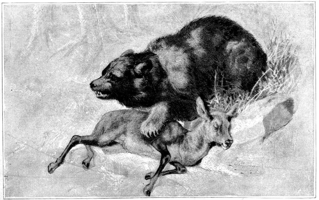 Sometimes, however, a bear will take to killing fresh meat for itself. Indeed, I think it is only its clumsiness that prevents it from becoming an habitual flesh-eater. Deer are so agile that bears can rarely get them; yet on occasions not only deer, but moose, buffalo, and elk fall victims to them. Wild game, 32however, are so shy, so agile, and so alert that it is only rarely they afford meals to old Ephraim—as the mountain hunters call the grizzly.