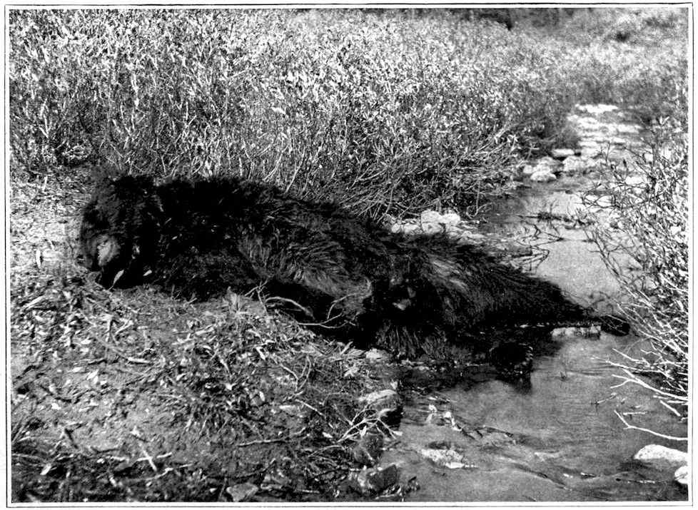 The angry ranchman swore vengeance, and set a trap for the bear, hoping it would return. The sly old beast, however, doubtless was aware that the body had been visited, for he never came back, but returned to the river-bottom, and again from time to time was heard of as slaying some animal. However, at last his fate overtook him. Early one morning a cow was discovered just killed and not yet eaten, the bear having probably been scared off. Immediately the ranchman put poison in the bait which the bear had thus himself left, and twenty-four hours later the shaggy beast was found lying dead within a dozen yards of his last victim.