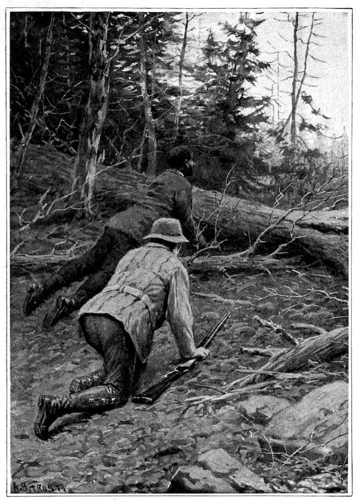 I did not have long to wait. In a couple of minutes the bugle of a bull came echoing across the basin through the frosty morning. Evidently my friend was still travelling, hunting for some possibly weaker rival. Almost immediately I heard far off another answering the challenge, and I stood up and meditated what to do. There was very little air, but such as there was blew to one side of the spot from which the last challenge seemed to come, and I immediately struck off at a trot through the woods to get below the wind.