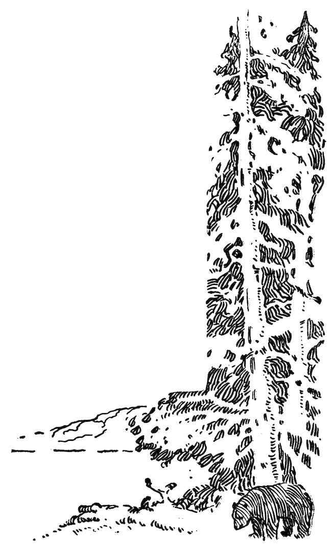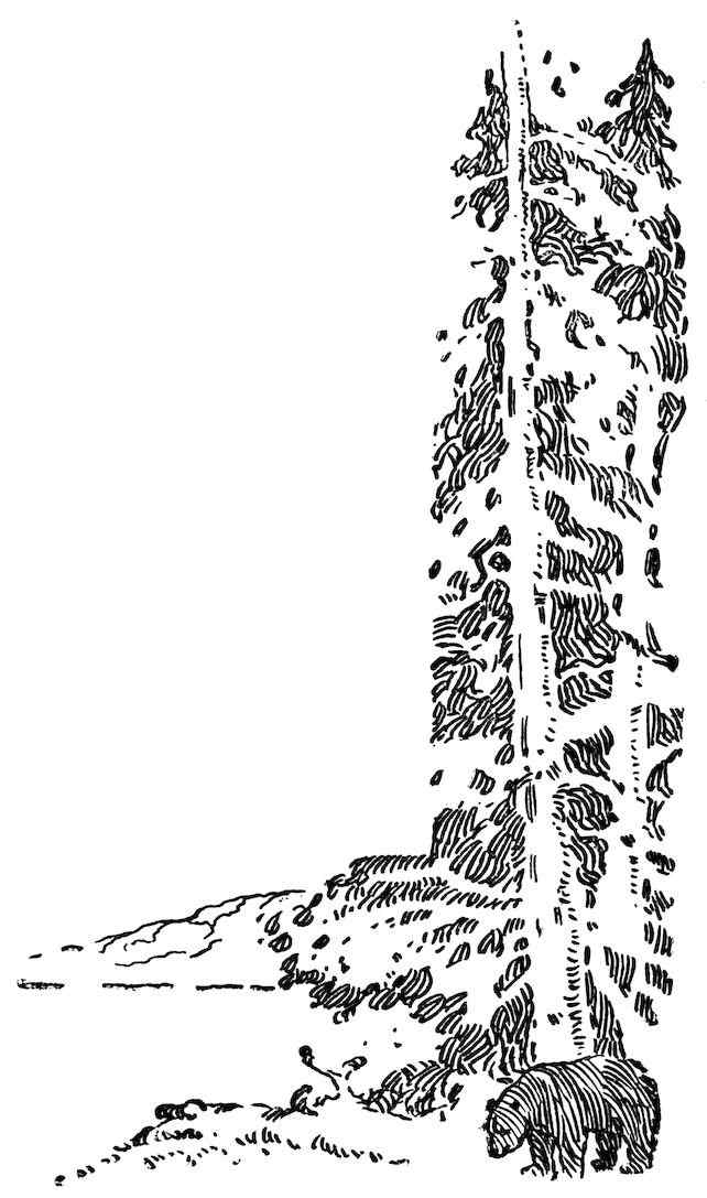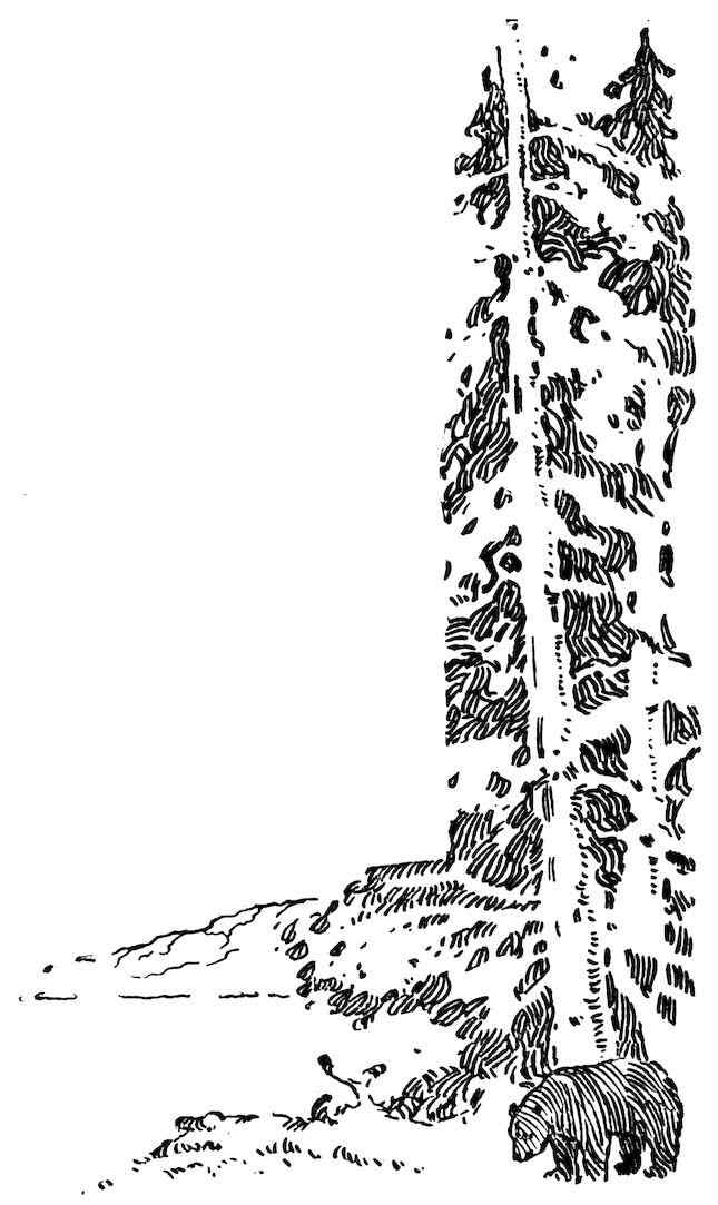 Besides roots and berries, the bear will feed on any small living thing he encounters. 31If in plundering a squirrel’s cache he comes upon some young squirrels, down they go in company with the hoarded nuts. He is continually knocking to pieces and overturning old dead logs for the sake of devouring the insects living beneath them. If, when such a log is overturned, mice, shrews, or chipmunks are found underneath, the bear promptly scoops them into his mouth while they are still dazed by the sudden inrush of light. All this seems rather ludicrous as the life work of an animal of such huge proportions and such vast strength.