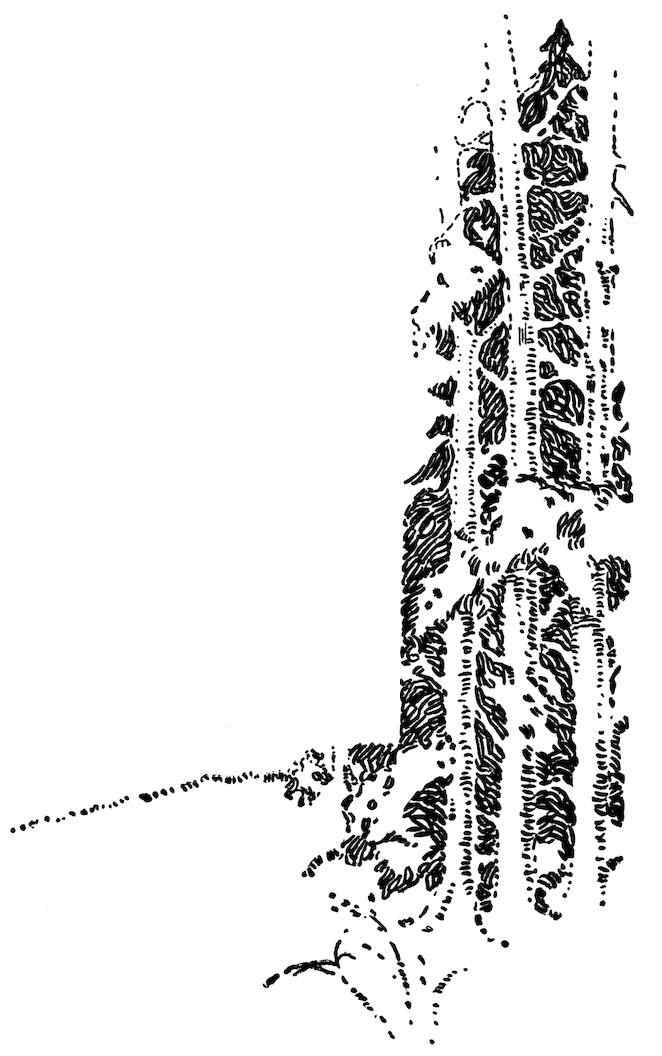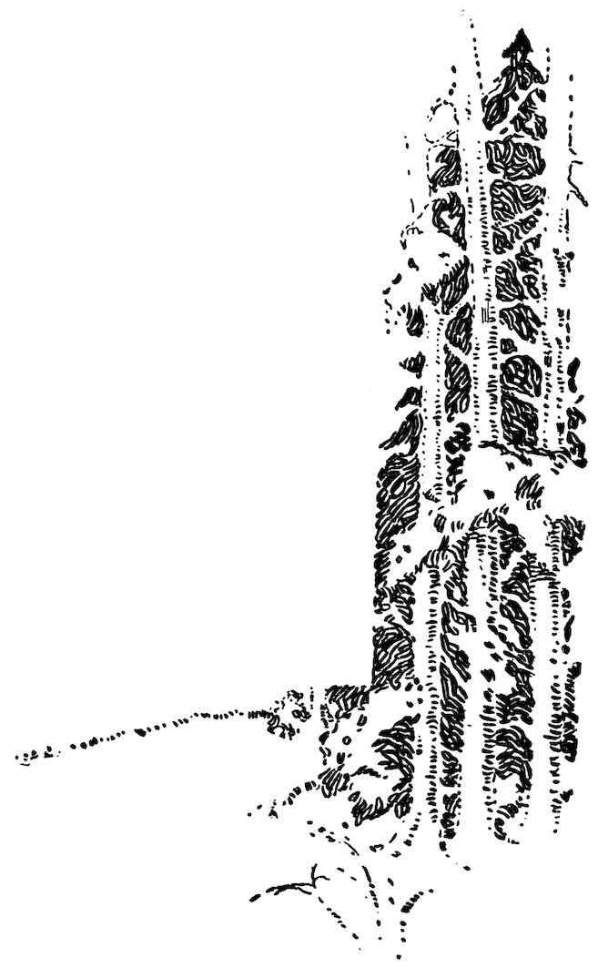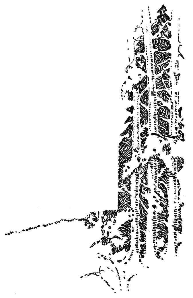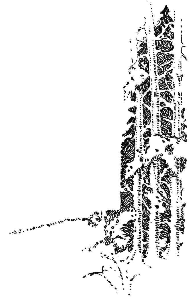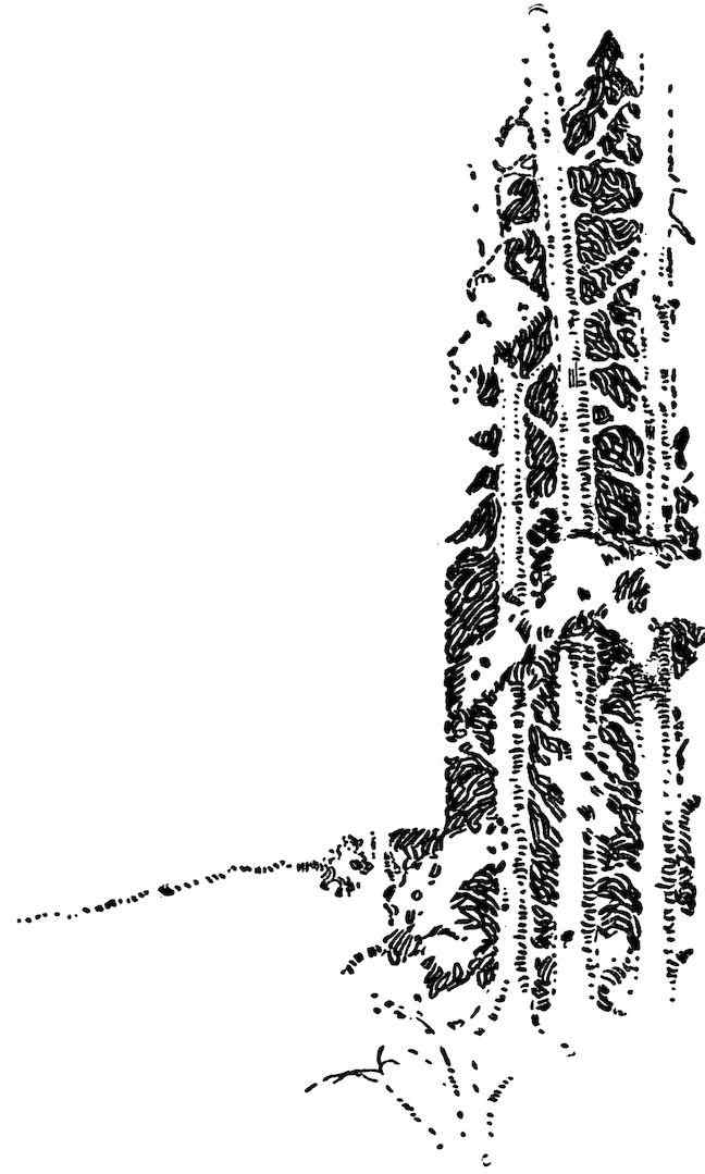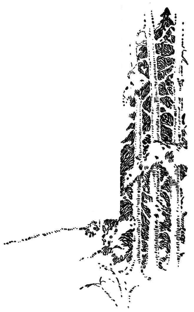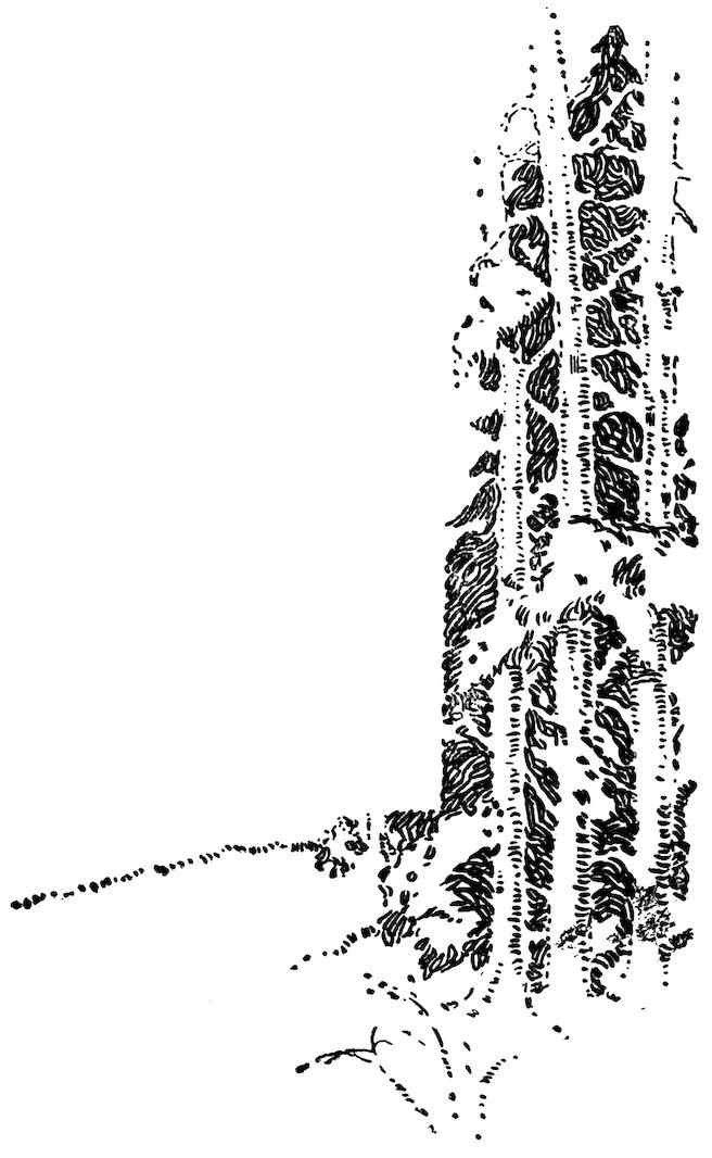 Looking at my watch, I saw that it was nearly dawn. I returned to the tent and laid down as I was under the blankets, and shivered and dozed for half an hour, then I came back to the meadow, where the pack-ponies stood motionless. In the brightening light the moon paled, and I was very soon able to pick out the bull’s trail on the frost-covered ground, where it was almost as plain as if he had been walking in snow. I saw that he had struck up a long valley, from which a pass led into a wooded basin. At the top of the pass I lost the trail entirely, and as it was almost impossible to see for any distance through the woods, I came to the conclusion that the best thing to do was to sit down and await events.