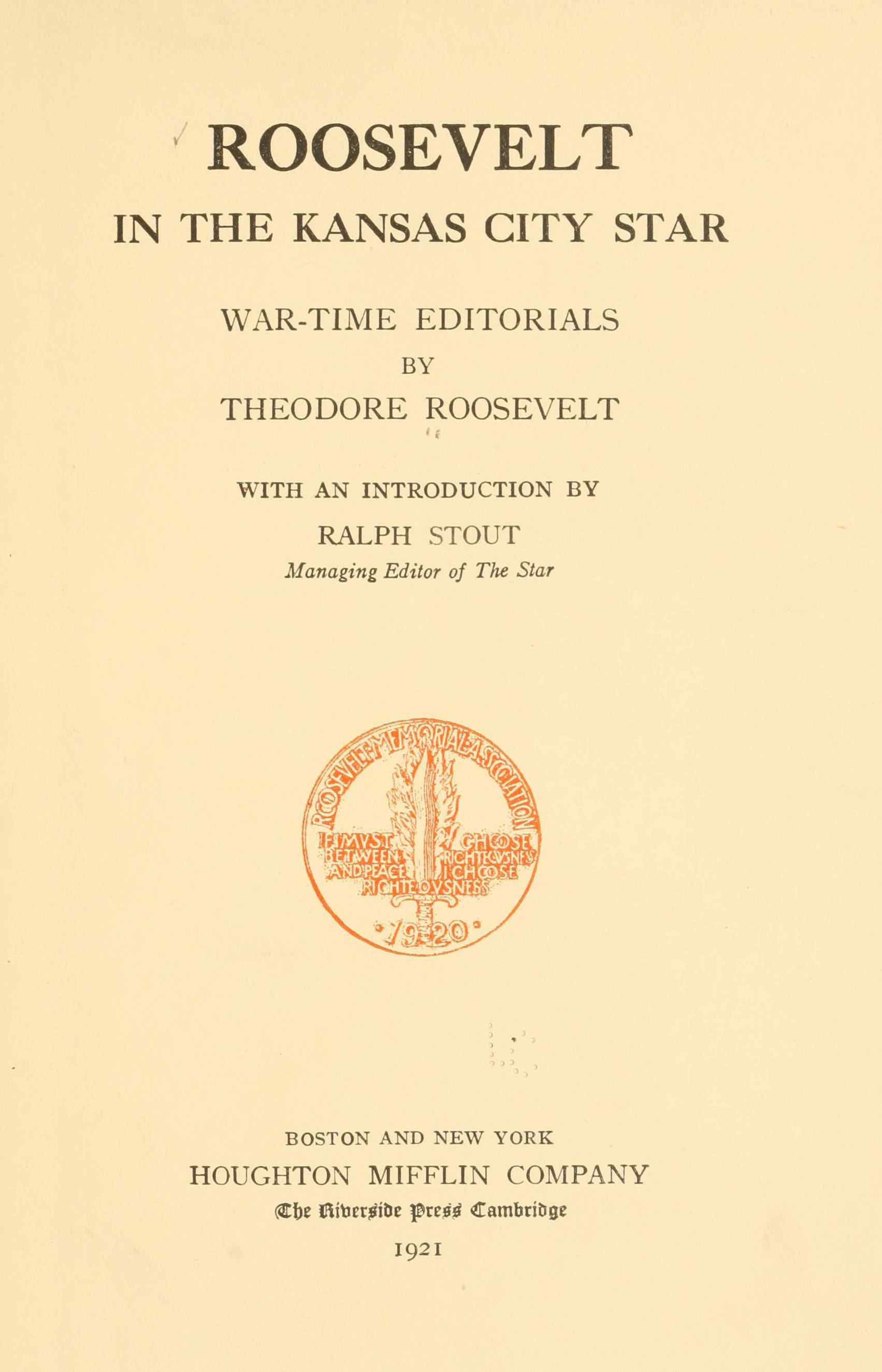 The request, repeated and urgent, has come from many sources that the editorial articles, contributed by Colonel Theodore Roosevelt to The Kansas City Star during our country’s participation in the World War, be preserved for the future. It is in response to this request that this volume is published.
