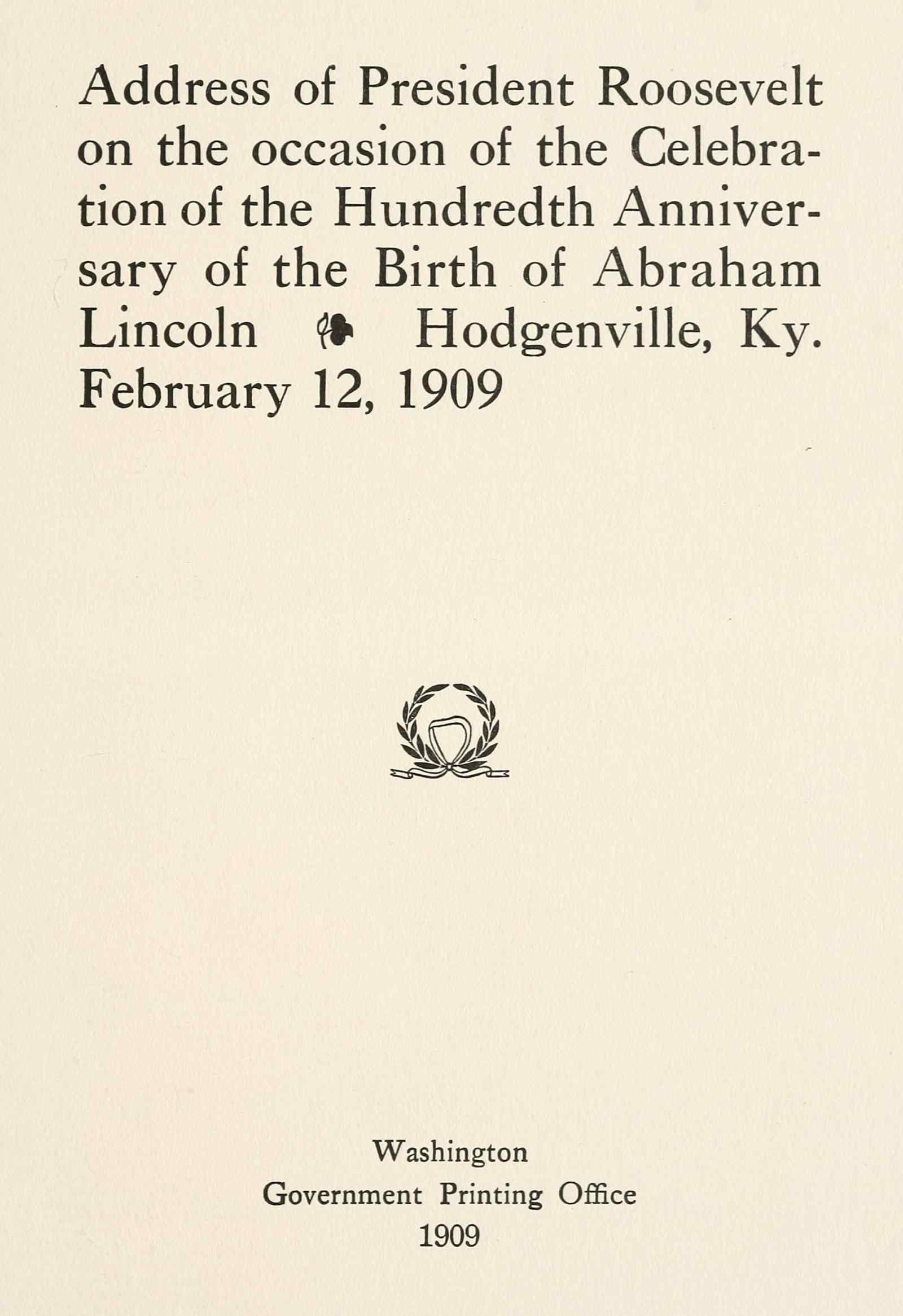 Title: Address of President Roosevelt on the occasion of the celebration of the hundredth anniversary of the birth of Abraham Lincoln, Hodgenville, Ky., February 12, 1909
