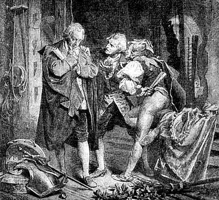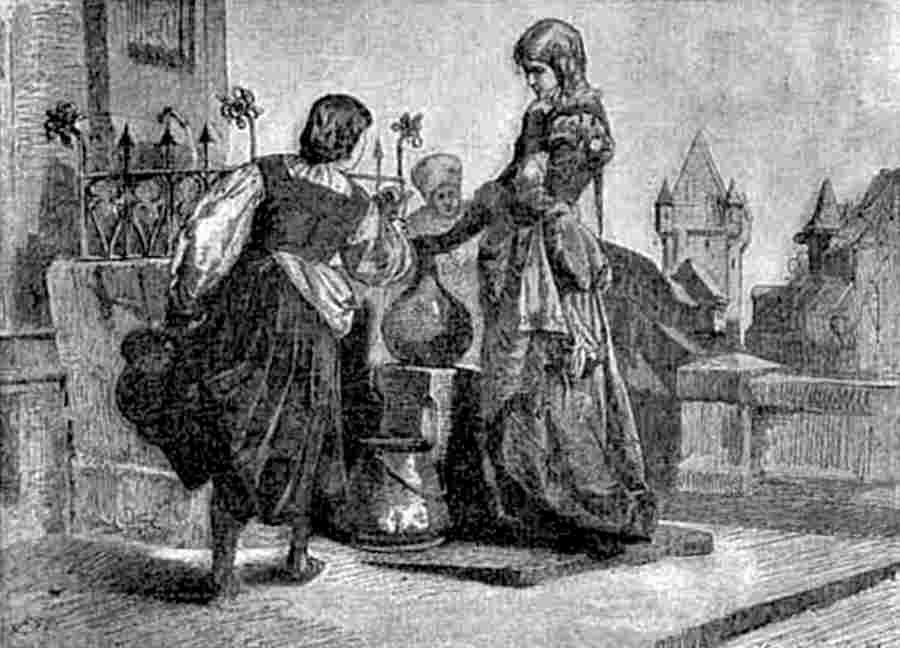 Y aquella imagen encantadora era creación exclusiva de Goethe: no hay rastro de ella en ninguno de los Faustos anteriores. Figuraba, sí, en la literatura popular la trágica historia de las doncellas burladas en sus amores, que apelan al infanticidio para ocultar la seducción, y pagan en el patíbulo su crimen. Sin ir más lejos, tenemos un ejemplo interesantísimo en el cancionero catalán y valenciano: La filla del marxant, cuyas numerosas variantes ha recogido y publicado, con las de otros muchos romances antiguos, el eruditísimo Sr. Milá y Fontanals, es una de esas desdichadas víctimas del amor.[8] Pero Goethe tuvo la feliz inspiración de llevar esas femeniles desgracias, que inspiraron también a su gran amigo Schiller[9] una de sus mejores poesías, a la historia tétrica del Doctor endiablado; y el contraste de ese amor de Margarita, idílico primero, y después trágico, pero siempre cándido, verdadero, naturalísimo, con las fantasías insensatas y los vagos anhelos de Fausto, con la mordacidad ponzoñosa de Mefistófeles, con aquel cuadro fantástico en que giran alrededor del espíritu humano las brujas y los ángeles, el Cielo y el Infierno, da al extraño poema un interés dramático, un calor del corazón, una realidad de vida, que superan quizás a todas las demás bellezas que en él derramó más tarde el genio creador del insigne poeta.