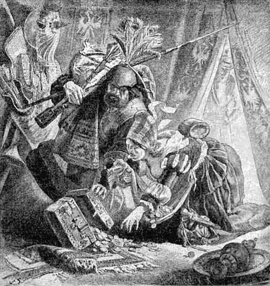 Fausto y Mefistófeles no estuvieron ociosos mientras tanto. Encontraron los tesoros que habían prometido al Emperador, y con tanp. 357 feliz hallazgo se pagaron las deudas, se llenaron las arcas del Tesoro, y volvió a reinar la tranquilidad en el esquilmado imperio. En esta extraña escena, Goethe quiso simbolizar el invento del papel-moneda. La fantasmagoría concluye con el reparto de dádivas que hace el Emperador a sus súbditos.