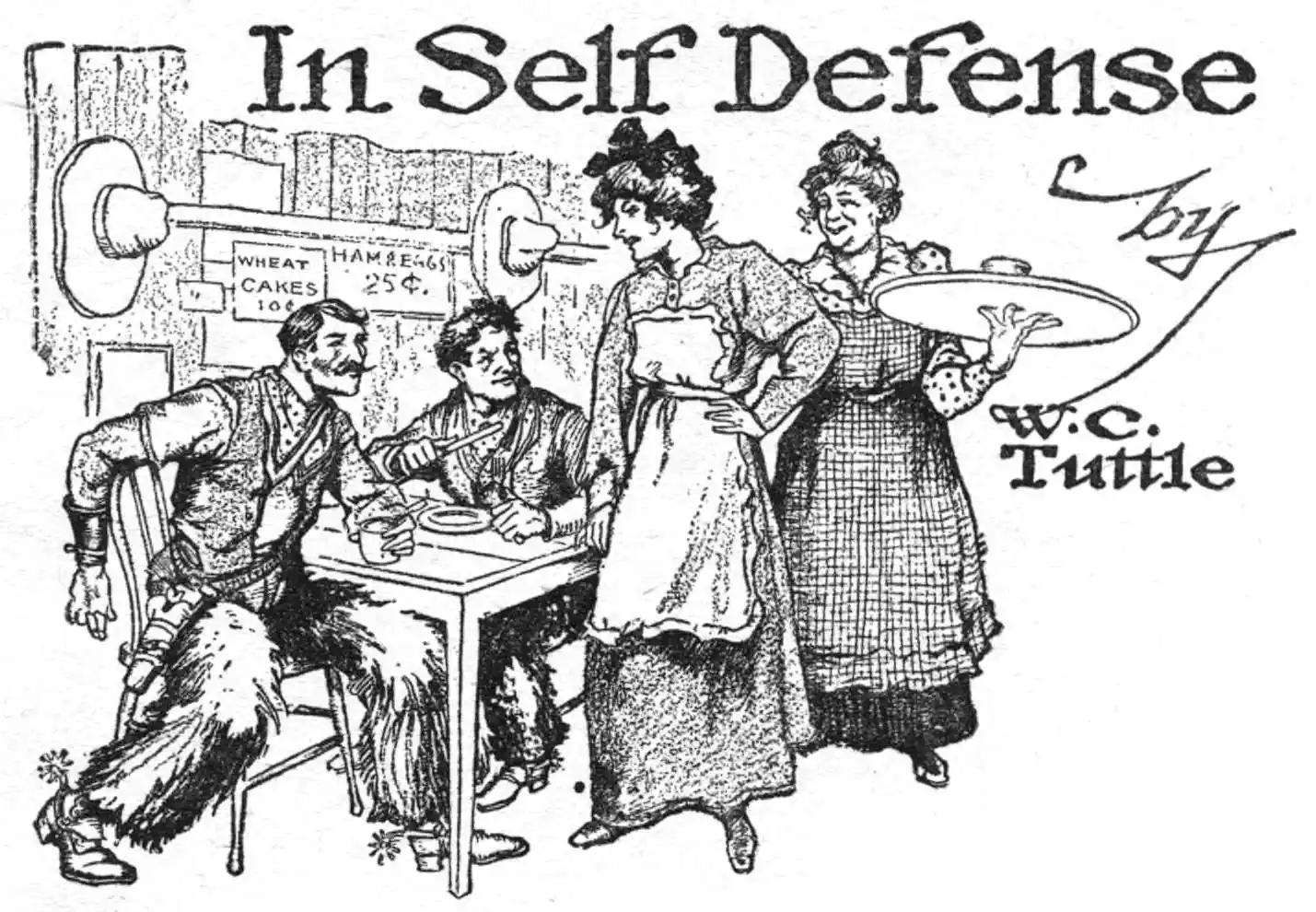 They has a few more drinks and then decides to eat, so they ambles across th’ street to Jimmy Peyton’s Boston Chop House, th’ only eatin’ place in th’ town. There ain’t nobody in sight, so Ren yells—