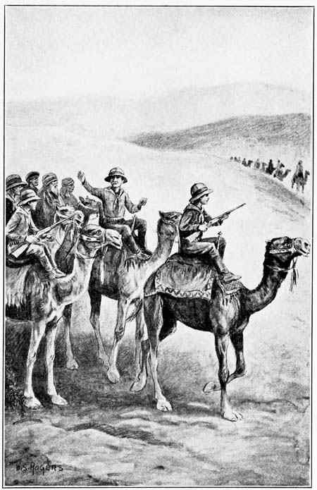 Gradually the camels, under the prodding of their hidden masters, began to move slowly toward the base of the slope so as to diminish the distance when the time came to charge. It would have been easy to bring some of the[210] camels down, but the explorers stayed their hands.