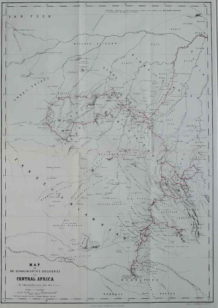 He was born at Riga in December 1836, and was the son of a merchant. He studied at Heidelberg and Berlin, where he took his degree as Doctor of Philosophy, and devoted himself from his boyhood to the science of botany. At his first school one of the masters was a son of a missionary in South Africa; he used often to describe the wonders of that country, and perhaps it was in this manner that his mind was turned towards that country which afterwards created his career. But the proximate cause was a collection of plants placed in his hands to arrange and describe. In 1860, the young Freiherr von Barnim, accompanied by Dr. Hartmann, had made a journey in the region of the Nile, where he had fallen a victim to the climate. His collections were brought home, and as Schweinfurth day after day studied these dry corpses, a yearning came upon him to go to[Pg vii] the land where he might behold them in all their bloom and their beauty, and where he might discover new species—those golden joys for the explorer. In 1863, he left Berlin for Egypt, and having botanised in the Delta of the Nile, travelled along the shores of the Red Sea, skirted the Highlands of Abyssinia, passed on to Khartoom, and finally, his purse being empty, returned to Europe, after an absence of two years and a half, with a splendid collection of plants. But soon he languished for Africa again, and submitted to the Royal Academy of Science a plan for the botanical exploration of the equatorial districts lying west of the Nile. His proposals were at once accepted; he received a grant of money from the Humboldt Institution, and, in 1868, he landed in Egypt. During three years he was absent in the heart of Africa, and, even before he had returned, his name had already become famous in Europe and America. Travelling, not in the footsteps of Baker, but in a westerly direction, he reached the neighbourhood of Baker’s lake, passing through the country of the Niam-Niam, and visiting the unknown kingdom of Monbuttoo. As an explorer, he stands in the highest rank, and merits to be classed with Mungo Park, Denham and Clapperton, Livingstone, Burton, Speke and Grant, Barth and Rohlfs. He can also claim two qualifications which no African traveller has hitherto possessed. He is a scientific botanist, and also an accomplished draughtsman. Park had some knowledge of botany, and Grant made an excellent collection, but both must be regarded as merely amateurs. In other works of African travel the explorer has given rude sketches to some professional artist, and thus the picture has been made; but Schweinfurth’s sketches were finished works of art. In a geographical sense, this work is of importance as a contribution to the problem[Pg viii] of the Nile; and ethnologically it sets at rest a point which has long been under dispute, viz., the existence of a dwarf race in Central Africa. These Pygmies are mentioned by the classical writers; much has been said about them by modern travellers on the Nile; Krapf saw one on the Eastern Coast; the old voyagers allude to their existence in the kingdom of the Congo, and Du Chaillu met them in Ashango Land. Yet still much mystery remained which, thanks to Schweinfurth, is now at an end. That such a race exists is now placed beyond a doubt; and it is probable that these dwarfs are no other than the Bushmen of South Africa, who are not confined, as was formerly supposed, to that corner of the continent, but also inhabit various remote recesses of Africa, and were probably the original natives of the country.