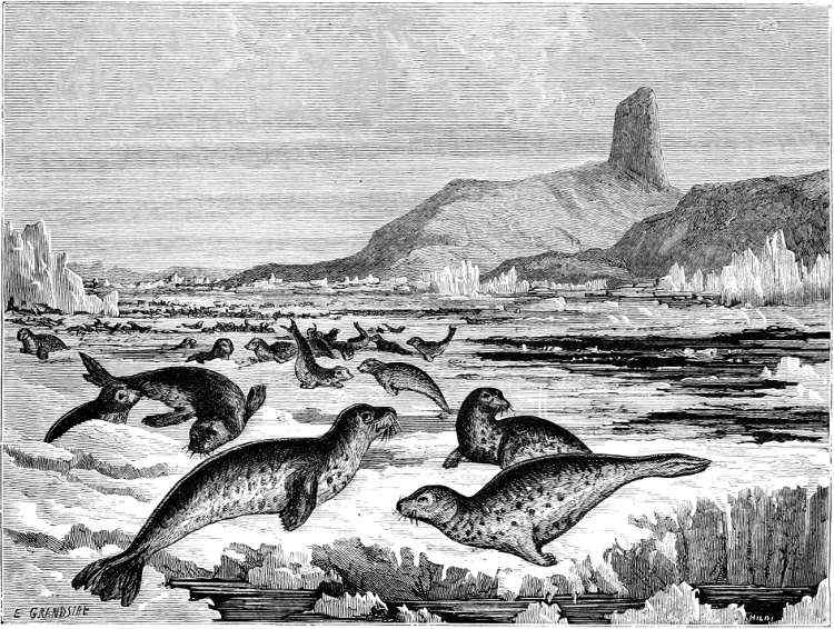Of mammals, the species found farthest north were the Arctic fox, the wolf, the ermine, the Polar hare, the lemming, and the musk-ox,—all of which were seen on the shores of the great Polar Basin or Palæocrystic Sea. No cetaceans were sighted north of Payer Harbour, near Cape Sabine; a fact which renders all the more serious the gradual process of extermination of the Greenland (or right) whale in more southern latitudes. The only seal found beyond Cape Union, in lat. 82° 15’ N., was the little ringed seal or “floe-rat” (Phoca hispida).