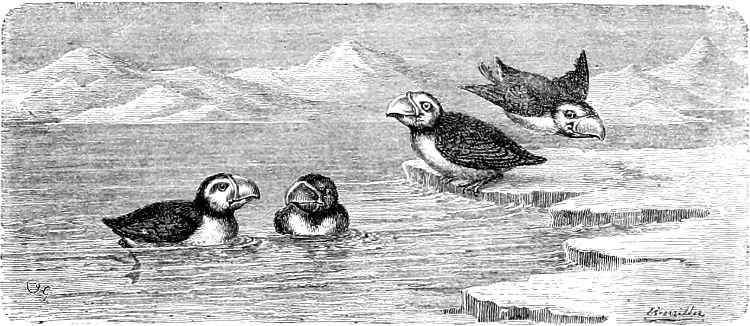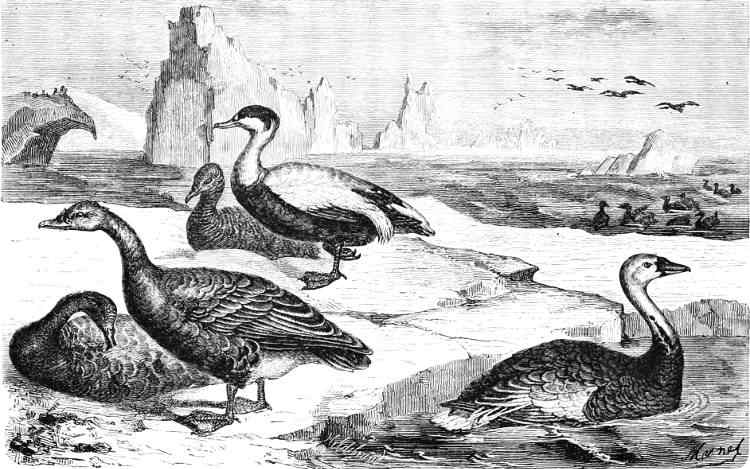 So far as the land extended, bird life prevailed; the species being the snowy owl, the snow-bunting, and the ptarmigan. Full collections were made of all the birds frequenting Smith Sound; and our naturalists had the satisfaction of discovering the long-sought-for breeding-haunts of the knott and sanderling.[13]