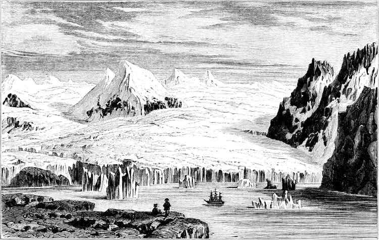 The temperature now sunk again below freezing-point. The brief Arctic summer was over, and day and night the young sea-ice formed continuously. The mists that had hitherto accompanied the ships cleared away before a brisk northerly wind, and revealed a magnificent panorama of lofty mountains, white with shrouds of snow, and deep valleys filled with colossal glaciers. One of these stretched downwards to the shore, and threw off great icebergs which floated or stranded in Dobbin Bay. It was named after the Empress Eugénie, who had taken a lively personal interest in the expedition.