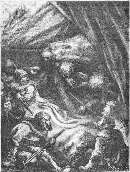In explanation of some passages in the foregoing spirited effusion, we may state that the six sledges belonging to the Alert were named respectively, Marco Polo, Victoria, Challenger, Poppie, Bulldog, and Alexandra. “Hercules” appears to have been the nickname of one of the strong men of the ship.