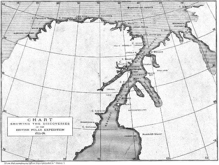 Captain Nares observes—and his eulogium will be endorsed by the reader—that no two officers could have accomplished this laborious enterprise with greater ability or courage than Commander Markham and Lieutenant Parr. And it is but just that the services of Rawlings and Lawrence, the captains of the two sledges, should be put on record. In addition to their general cheerfulness and good-humour,—qualities which always help to lighten difficult work,—to their care and skill were due the safe return of the sledges, on which the lives of all depended—safe, uninjured, and in as serviceable a state as when they left the ship, notwithstanding the terrible character of the road they had travelled. To such men as these, and to the brave,[329] patient, resolute sledge-crews generally, we owe the tribute of our praise. However severe their privations, they never complained. During this memorable journey to penetrate to the north over the rugged Polar Oceanic ice, a journey in which the “pluck” and determination of the British seaman were most conspicuously displayed, day after day, against obstacles which might well have been regarded as insurmountable, the two officers and their brave followers succeeded in advancing the Union Jack to latitude 83° 20’ 26″ N.,—or within four hundred miles of the North Pole.