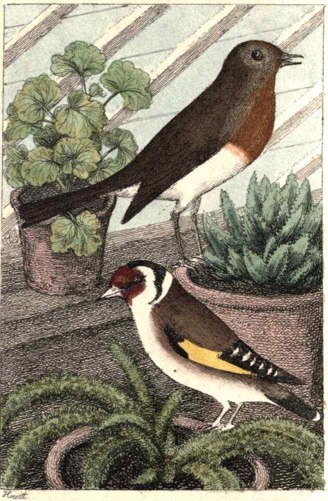 “I, with four others, first saw the light in the delightful month of June. We were hatched in an apple-tree, which stood in the midst of a good kitchen-garden. I need not describe to you the affectionate cares of our beloved parents: you have[Pg 24] too recently experienced the tender solicitude of yours, to have lost the remembrance of it; and as it is a sentiment which pervades the whole of the feathered race, it is nearly the same in all the species. Let it suffice then, that their cares were more than repaid by our health and safety. We became very fine little birds, and were just fledged: our parents began to talk of teaching us to use our little wings, which as yet we had not so much as expanded, and one evening I heard my mother telling my father that it was high time we should decamp, as she had great reason to suspect that the nest had been closely observed by the gardener. My father, on hearing this suspicion, immediately concluded that it would be expedient to remove on the following day; and we, who were sufficiently awake to hear the conversation, promised ourselves much pleasure from the projected excursion of the morrow. But, alas! how often have I experienced that we deceive ourselves with the hopes of[Pg 25] happiness we are destined never to enjoy! These, my first hopes, were the more sanguine, as I had never known disappointment, and, consequently, I suffered more acutely from their not being realized.