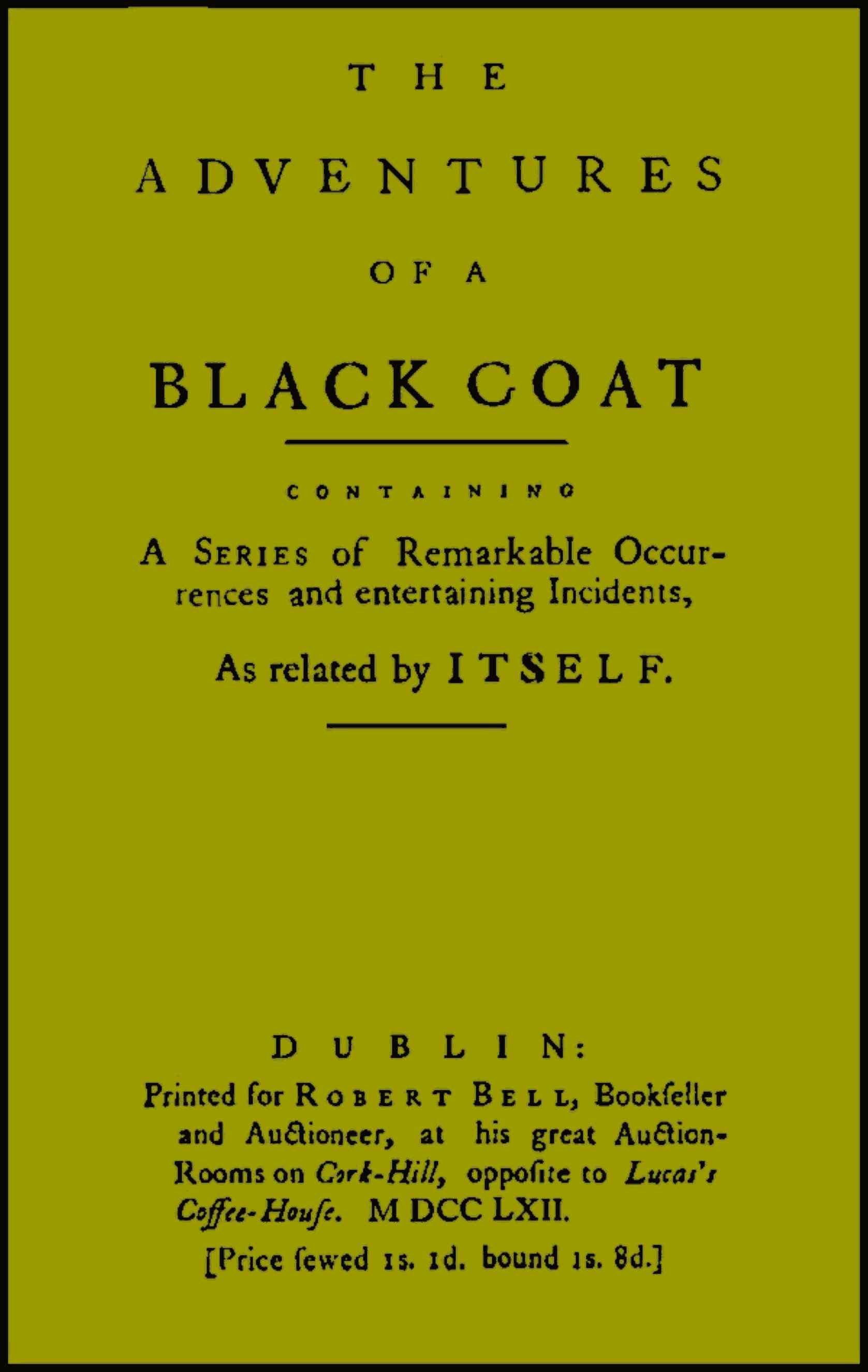 A Sable coat, whose venerable rents confest a life of business, and a length of years, long had hung sole tenant of a wardrobe; till a gay white coat with care was ushered in, and laid at decent length: when lo! with mortal voice, and sounds articulate, Sable was thus heard to address the stranger: “Thy presence, spark, [Pg 14] warns me of my approaching dissolution; but when I cast a retrospect over my former life, and behold thy native purity and unblemished form, I cannot but pity the many and various misfortunes thou art, in all probability heir to.”—To whom, White, “And when I behold thy queer shape and rustic aspect, I cannot but return thy pity, and offer up my prayers against longevity.”—Sable replied, “Boy, know that the depredations of time, and the unseemly appearance of industry, are not proper subjects of ridicule: were it possible thou couldst foresee the train of misfortunes, which in the course of thy existence, and revolutions of thy fortune, thou will be subject to, that gay and happy [Pg 15] mien would be changed to a gloomy and melancholy aspect.” Here White bowed humility, craved the sages pardon, and supplicated his advice in the conduct of his life. Sable, finding it a coat of manners, and pleased with the deference paid to his importance, thus answered, “To give advice is easy, but to profit by it is difficult; I will therefore (if thou hast patience to listen) rehearse to thee the vicissitudes of my fortune, from my first formation to this time, so that thou may’st profit by my misfortunes, and learn to bear thy lot, (whate’re it may be) with patience and resignation; and believe me thou wilt have occasion for philosophy.” White politely expressing his desire to be informed of the sage’s life, he [Pg 16] thus proceeded: When I contemplate the scenes I have experienced, and meditate on the vile schemes I have been obliged to countenance in those whose sole merit and reputation on arose from my close attachment to them, my very threads blush at the indignity. Here Sable was heard to sigh most piteously, and White, ’tis thought, laughed in his sleeve. After a pause of some minutes—Sable thus opened the relation of his adventures.
