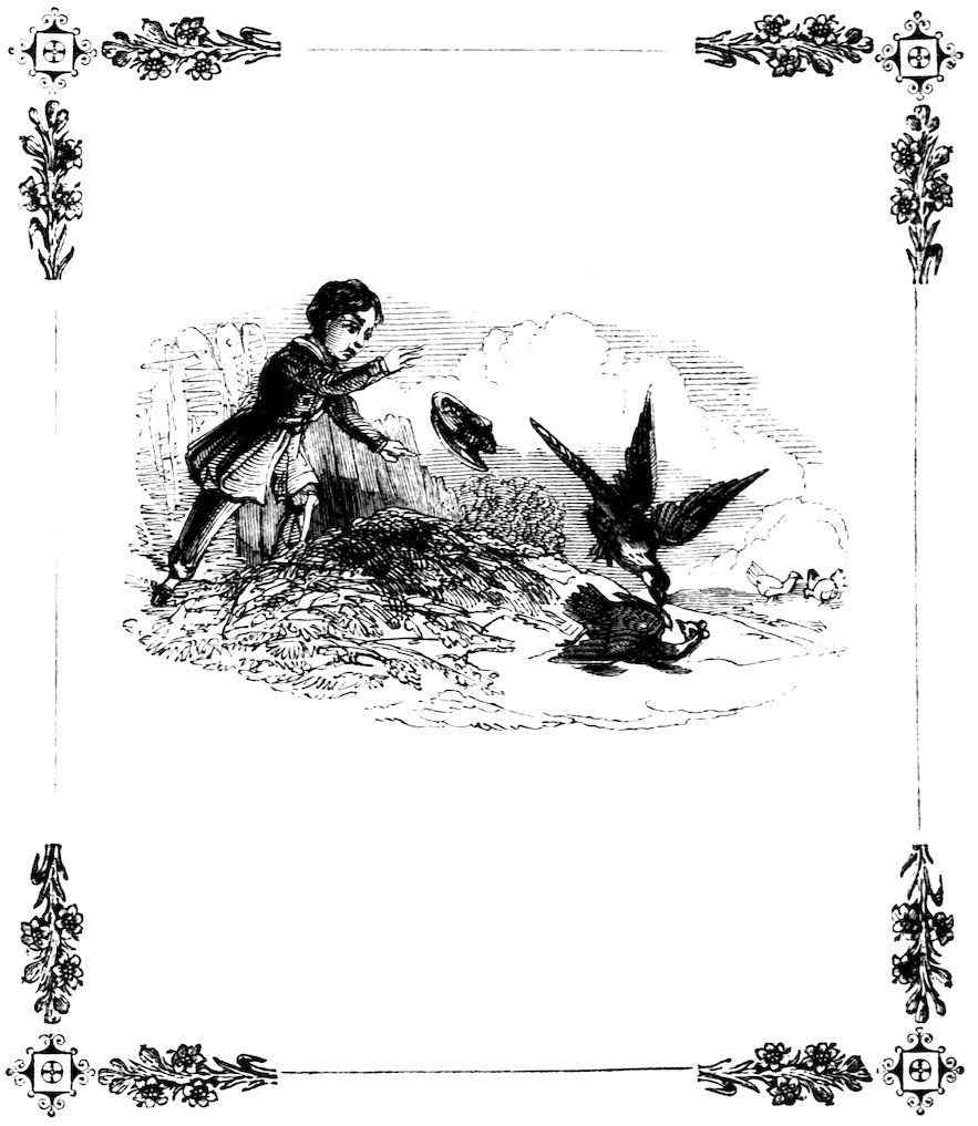 37“Oh, aunt!” says Charles, “as soon as I came from school, I went to the farmyard to feed my fowls; and it was very well I did, for what should I see but a cruel hawk pounce down in the midst of my poor chicks: the old hen flew at him, and pecked him well with her beak, and shook her wings at him, but he was too bold to care for that; so I gave a loud shout, and flung my cap at him, just as he flew off with the white chick in his claws. I aimed so well, that the cap struck him, and made him drop his prey: I then ran to it, but the poor thing was quite dead, and its nice white down was all dyed with blood. Do you know, dear aunt, I felt so vexed that the tears came into my eyes; but then I thought I must not be angry with the hawk, for God made it, and had taught it what sort of food to take home to its young ones.”