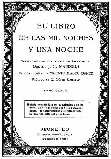 Pero respecto á Sett Budur, le ocurrieron cosas tan maravillosas y sorprendentes, ¡oh rey afortunado! que me apresuro á hablarte de ella. ¡Verás!
