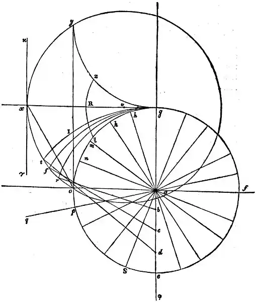 But this singular property is not confined to the conchoid, but is found in the following curve. Conceive that the right line A C which is perpendicular to the indefinite line X Y, is equal to the quadrantal arch H D, described from the centre C, with the radius C D: then from the same centre C, with the several distances C E, C F, C G, describe the arches E l, F n, G p, each of which must be conceived equal to the first arch H D, and so on infinitely. Now, if the points H, k, l, n, p, be joined, they will form a curve line, approaching continually nearer to the right-line A B (parallel to C Y) but never effecting a perfect coincidence. This will be evident from considering that each of the sines of the arches H D, l E, n F, &c. being less than its respective arch, must also be less than the right-line A C, and consequently can never coincide with the right-line A B.
