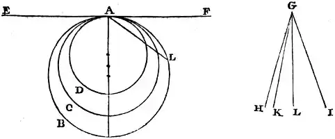 The cornicular angle is that which is made from the periphery of a circle and its tangent; that is, the angle comprehended by the arch L A, and the right line F A, which Euclid in (16. 3.) proves to be less than any right-lined angle. And from this admirable proposition it follows, by a legitimate consequence, that any quantity may be continually and infinitely increased, but another infinitely diminished; and yet the augment of the first, how great soever it may be, shall always be less than the decrement of the second: which Cardan demonstrates as follows. Let there be proposed an angle of contact B A E, and an acute angle H G I. Now if there be other lesser circles described A C, A D, the angle of contact will be evidently increased. And if between the right lines G H, G I, there fall other right lines G K, G L, the acute angle shall be continually diminished: yet the angle of contact, however increased, is always less than the acute angle, however diminished. Sir Isaac Newton likewise observes, in his Treatise on Fluxions, that there are angles of contact made by other curve lines, and their tangents infinitely less than those made by a circle and right line; all which is demonstrably certain: yet, such is the force of prejudice, that Mr. Simson is of opinion, with Vieta, that this part of the 16th proposition is adulterated; and that the space made by a circular line and its tangent, is no angle. At least his words, in the note upon this proposition, will bear such a construction. Peletarius was likewise of the same opinion; but is elaborately confuted by the excellent Clavius, as may be seen in his comment on this proposition. But all the difficulties and paradoxes in this affair, may be easily solved and admitted, if we consider, with our philosopher, that the essence of an angle does not subsist in ether quantity, quality, or inclination, taken singly, but in the aggregate of them all. For if we regard the inclination of a circular line to its tangent, we shall find it possess the property, by which Euclid defines an angle: if we respect its participation of quantity, we shall find it capable of being augmented and diminished; and if we regard it as possessing a peculiar quality, we shall account for its being incommensurable with every right-lined angle. See the Comment on the 8th Definition.