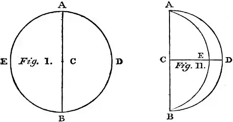 Thus let a part A E B cut off by the diameter A B (fig. I.) of the circle A E B D be placed on the other part A D B, as in fig. II. Then, if it is not equal to the other part, either A E B will fall within A D B, or A D B within A E B: but in either case, C E will be equal to C D, which is absurd.