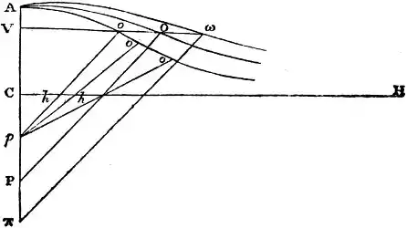In this curve it is manifest (on account of the right line P O, cutting the rule in H that the point o will never arrive at rule C H; but because h O is perpetually equal to C A, and the angle of section is continually more acute, the distance of the point O from C H will at length be less than any given distance, and consequently the right line C H will be an asymptote to the curve A O.