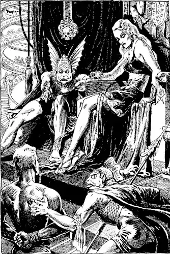 But if Steve was weaponless, another was not. A cry of burning rage burst from the lips of the Lady Loala, and a whirring something whispered a threnody of death across the room as she whipped a small, jeweled dagger from her side, hurled it at von Rath.