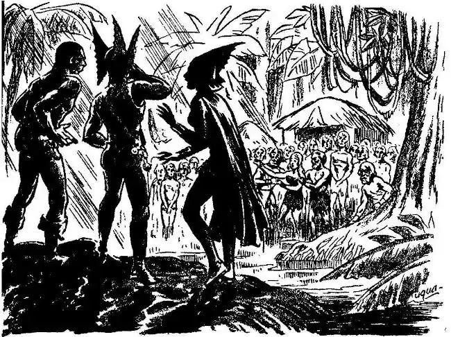 "The hell with him!" said Chuck. "Let him break his dirty Nazi neck!" But he obeyed. The German woke blubbering with pain and fright, howled for mercy when he discovered his hands no longer held a weapon of destruction. But no thought of vengeance motivated Steve at the moment; his sole interest was in learning what weird fate had befallen them. There was time and enough to handle their enemy as he deserved; now the problem was to find out what had happened. Therefore he gave the German the benefit of his advice, and in a short time the three erstwhile "statuettes" sat staring at each other in dim perplexity.