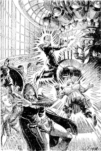 Nor was this all. In the same flashing movement Borisu snapped a ray pistol from the falling doctor's belt, turned its lethal muzzle upon those who leaped toward him. His mad voice rose in harsh command.
