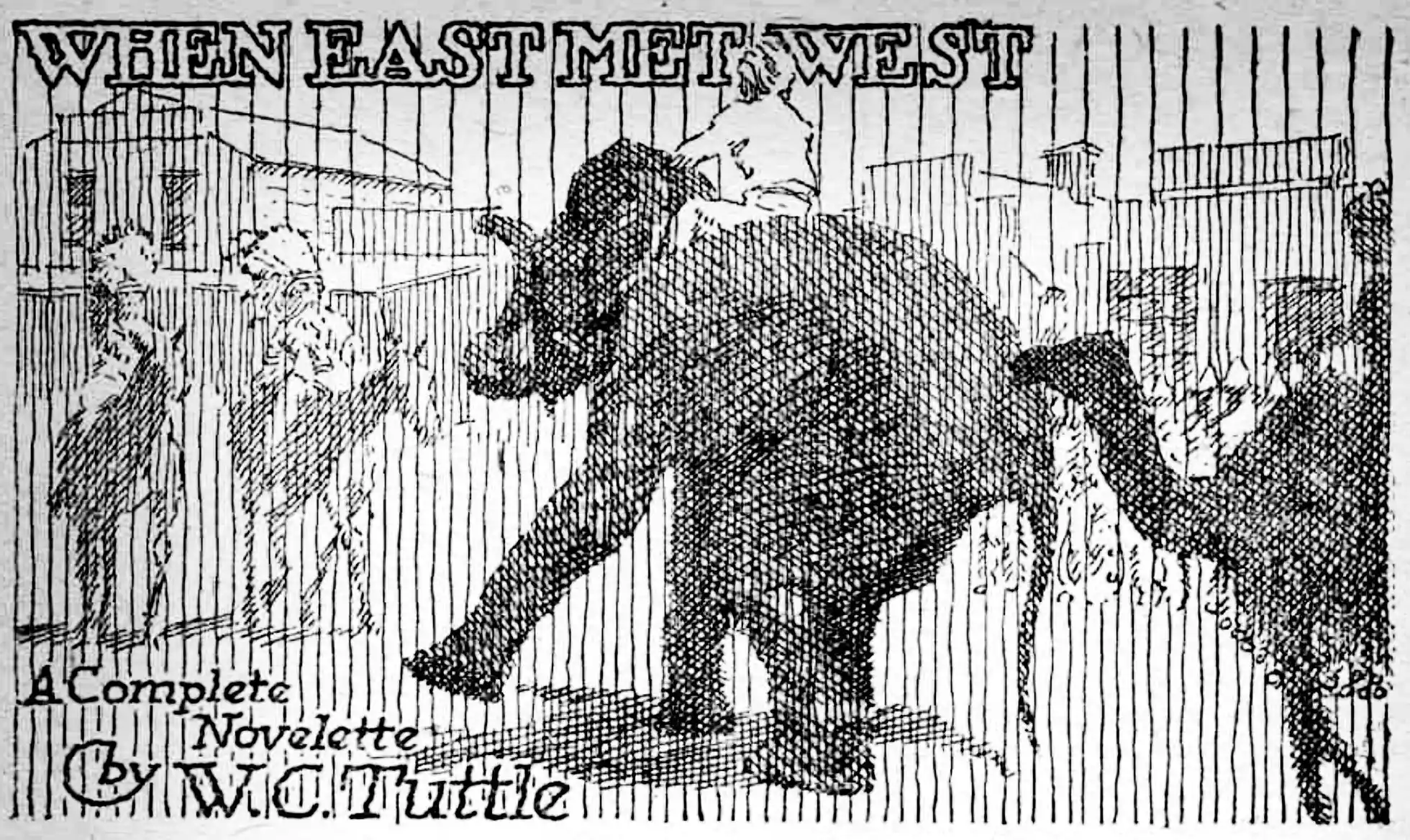 Just about that time Gunga Din comes around the corner. He ain’t got nobody on his back now, but he’s got a chair hooked around one hind leg. He runs into the hitch-rack, tried to go under it, and lifts it plumb out of the ground. This kinda makes him sore; so he wraps his trunk around one of the posts and starts for us, packin’ and draggin’ it along with him, while on the far end of it is tied a piebald bronc from Paradise.