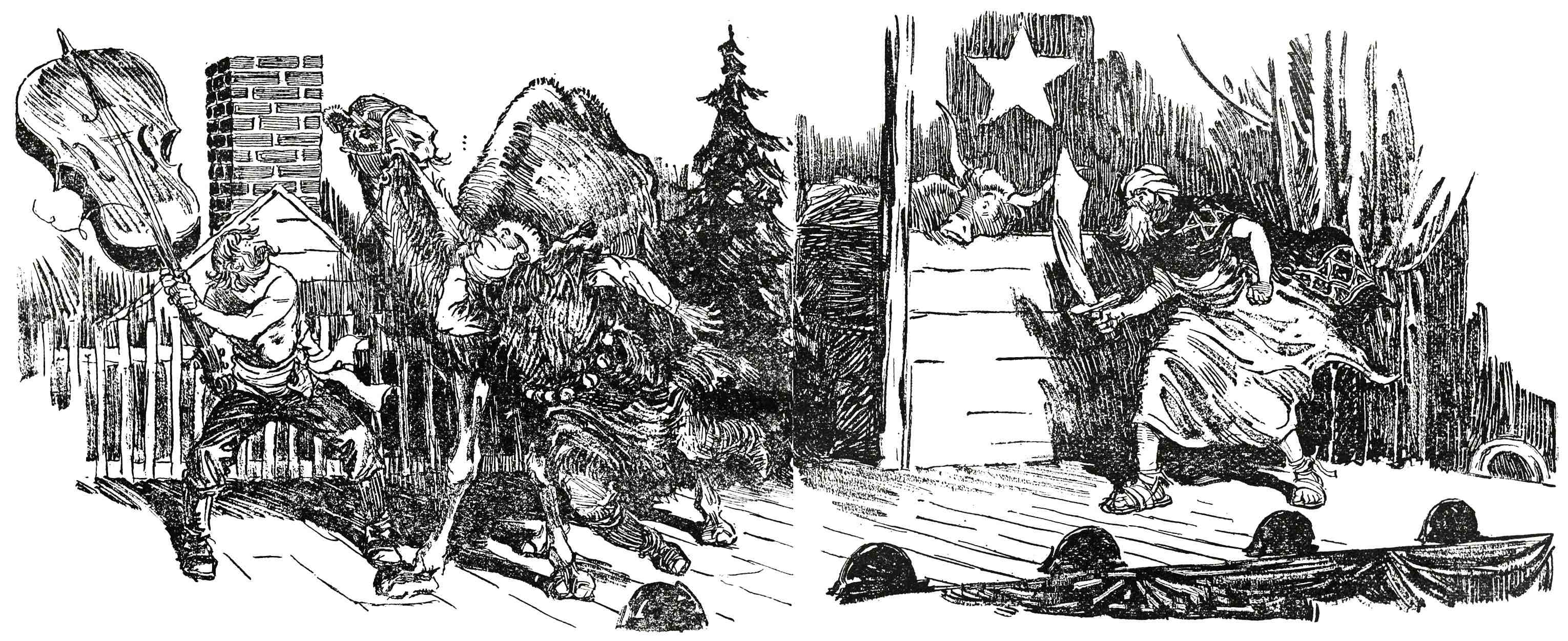 I dunno how I got out of there. That busted doorway wasn’t quite big enough, ’cause both of my legs had different ideas of direction. I’m still wearin’ part of that buffalo coat, and a long string of sleigh bells trail along behind me.