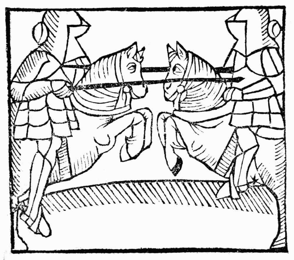 Incontinent que la jouste fut faite par les chevaliers le deffendeur se cuida retraire/ mais le beau doulx saillit en place comme ung cynge sur ung cheval fort & puissant quant le deffendeur le vit il se esmerveilla dont estoit venu cestuy chevalier estrange duquel on ne savoit le nom mais chascun l’appelloyt le chevalier blanc/ il le faisoit si beau veoir que merveilles. Son cheval faisoit pennades et saulx si merveilleux que chascun se esbahisoit comme il ne cheoit par terre. Quant les deux chevaliers eurent baillee la foy ainsi comme il est de coustume par le herault/ trompetes et clairons commencerent a sonner/ ilz misrent les lances en arrest et fut si expert le beau doulx que il fut au bout de la lice devant que le deffendeur peust partir et quant il vit ce il planta sa lance en terre et la mist par pieces et disoit chascun qu’il estoit de noble couraige. Incontinent l’autre lance luy fut baillee puis de rechief sonnerent les trompettes et partirent les deux chevaliers et par telle façon se rencontrerent que tous deux rompirent leurs lances/ mais le beau doulx le frappa si fermement que il getta homme et cheval par terre. Quant le cop fut fait chascun le loua et estoyt chascun esbahy de sa puissance et force/ on luy demanda son nom/ mais il respondit humblement. Seigneurs ne vous desplaise quant est de savoir mon nom je vous prie que vous vous deportés. Les dames & damoiselles qui la estoient requirent aux champions d’armes que ung autre allast contre luy/ lesquelz ne voulurent pas que on luy fist tant de peine/ car ilz pensoient qu’il fust traveillé a cause qu’il avoit rompu une lance contre terre et du noble coup qu’il avoit fait. Son maistre luy dist qu’il se retirast/ car nul n’estoit disposé de jouster. Quant il entendit parler son maistre il luy pria que il ne partist point du champ pour ung seul homme avoir mis par terre/ et que s’il luy plaisoit qu’il ne partiroit du lieu qu’il n’en eust gaigné troys ou qu’il fust par ung aultre vaincu. Et quant son maistre vit son noble couraige il fist le raport au seigneurs sans dire qui il estoit/ mais disant qu’il ne partiroit jamais du lieu que troys n’eussent jousté contre luy. Il y avoit ung tresvaillant chevalier au quel on avoit deffendu la jouste a cause que jamais on ne avoit veu homme plus fort ne plus vaillant que luy. Lequel par la voulenté de tous se disposa de venir contre le beau doulx/ et incontinent se alla armer. Les seigneurs chevaliers/ dames/ et damoiselles prierent au beau doulx qu’il se descendist affin qu’il se reposast ung petit ce pendant que son homme se prepareroit. A la quelle requeste ne voulut pas obeir/ mais les pria qu’il ne leur vousist desplaire/ car il ne descendroit de dessus son cheval tant que deux chevaliers eussent jousté contre luy/ ou qu’il en fut mis jus par coup de lance/ et les remercya tresgrandement de la courtoisie qu’il luy offroient faire. Quant l’homme contre qui il devoit jouster fut prest il se monstra au champ si bien armé que jamais on ne avoit veu homme si bien armé ne de si fortes armeures comme il estoit. Puis apres trompetes et clairons sonnerent apres que les promesses furent faites/ chascun mist la lance en l’arrest & piquerent des esperons si fort qu’il se rencontrent & tous deux rombirent leurs lances sans cheoir par terre si non que le cheval du fort chevalier cuida tomber. Apres on leur bailla nouvelles lances et vindrent si ardammant l’ung contre l’autre que le beau doulx coucha par terre homme & cheval/ puis rompit la lance contre terre si vaillamment que son cheval ploia les jambes de derriere. Tous les assistans se esbahyrent de la force & vaillance qui estoit en cest homme. Les dames & damoiselles vindrent vers luy le priant qu’il se deportast pour le present et que les joustes luy estoyent donnees & qu’il vint vers le chasteau pour prendre sa refection/ car ainsi plaisoit aux princes & chevaliers du pays. Il les remercya humblement de l’honneur qu’il luy presentoient/ nonobstant qu’il estoit bien marry en son cueur que nul ne vouloit jouster contre luy.