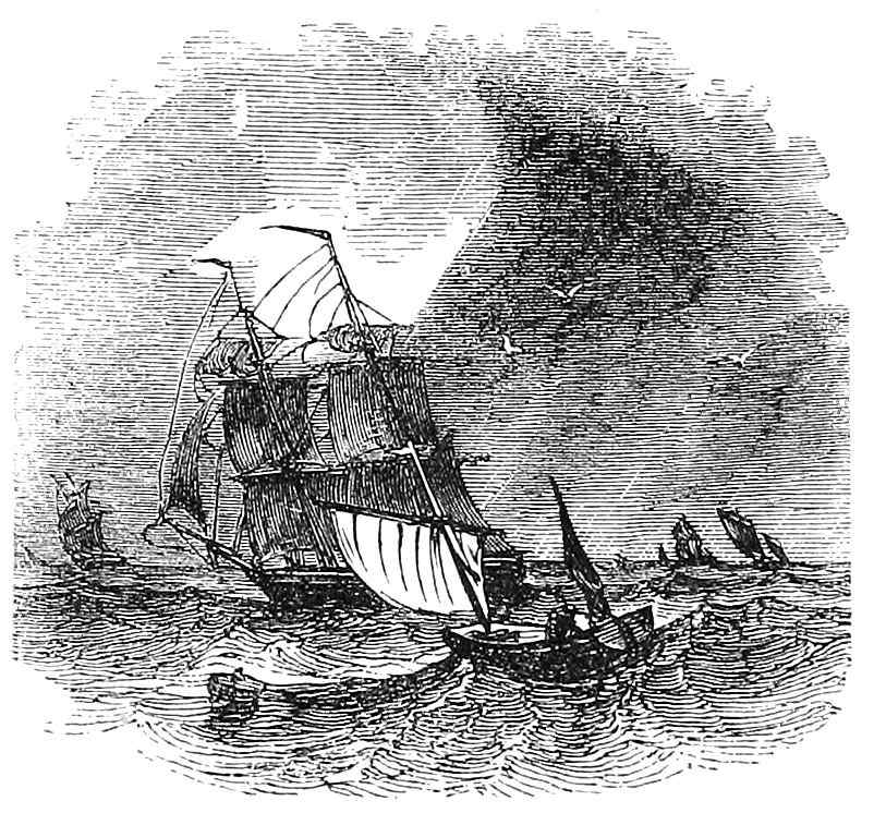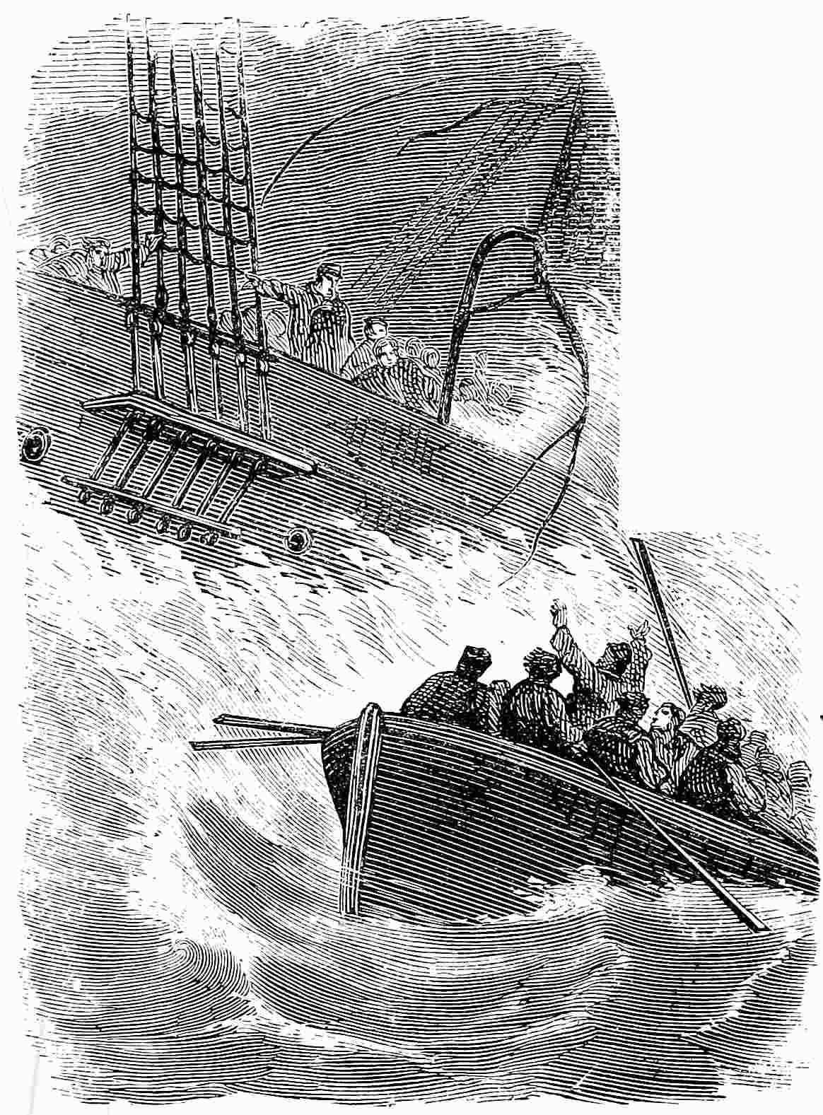Thursday night came on, and the boat still drifted before the wind, and about three o’clock the next morning a regular green sea broke over them and nearly half filled the boat. One of the passengers baled out the water constantly, and after the green sea came in the water was baled out with a bucket and cans. Before daylight, and as the moon rose, the men saw a vessel close alongside. They hailed her with all their might, and were heard by those on board; but as they could present no light they could not be seen, although they94 could see the ship tacking about for an hour trying to find them. The search was fruitless, and to their utter disappointment the ship was lost sight of. The men adhered to their course, and about nine o’clock sighted two vessels, but could not get near them on account of the cross seas. They rowed for one of them, however, for nearly five hours, and upon getting within hail she proved to be an Italian barque, the Marianople. The boat was very near filling when they were within twenty yards of her. They were struck by a heavy squall, so that all in the boat gave themselves up for lost. In consequence of the excitement on board—who can wonder at it?—they did not succeed in clearing one of the seas; but by only one of the men moving in the boat to bale her out, they were enabled to bale her clear, and a log line being thrown them from the barque, one by one they were drawn up on deck! The young midshipman Edwards was drawn on board by men who caught him by the collar of his coat.