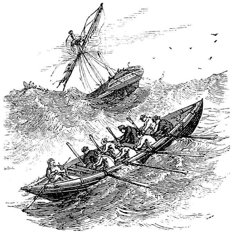 Nineteen persons had entered the port cutter. These consisted of the second and third engineers, one fireman, the boatswain’s mate, the quartermaster, the carpenter’s mate, the steward, the boatswain’s boy, five able seamen, and three passengers. They had received their course from the now drowned Captain—N.N.E. to Brest, which was 190 miles distant, and they had compasses on board. Under the direction of King, the men agreed, that whatever might happen they would sit immoveable, except when pulling at the oars. Two worked at each oar, and they ran before the sea. Both Daniell and King deserve the highest praise for their skill in steering the feeble craft over the raging waters, but it was pleasant to find them both modest and seamanlike in all they said about it.