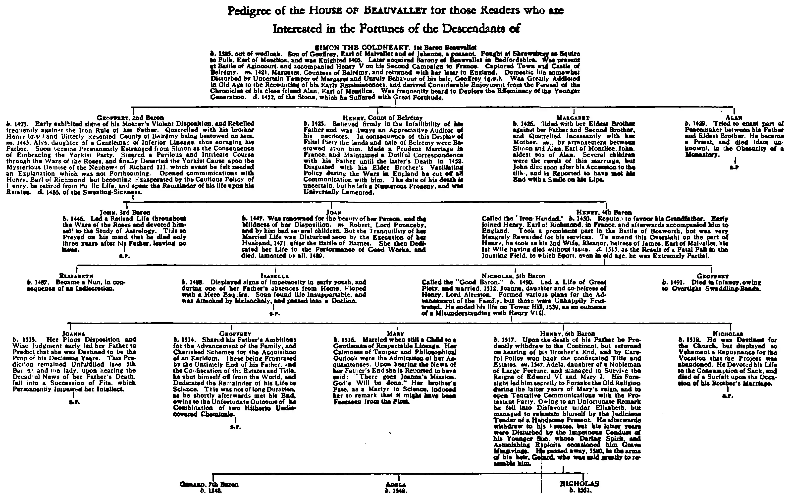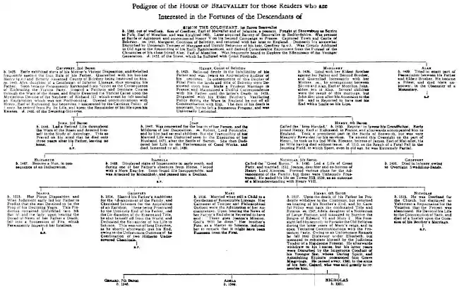 Pedigree of the House of Beauvallet for those Readers who are Interested in the Fortunes of the Descendants of SIMON THE COLDHEART, 1st Baron Beauvallet