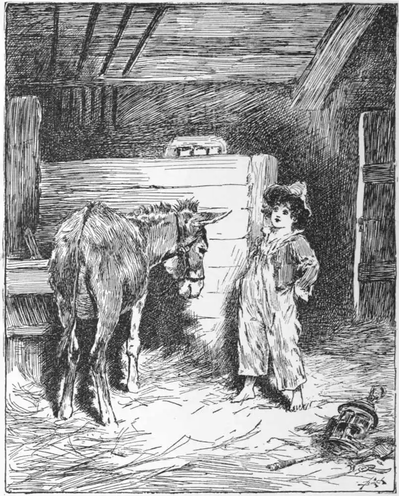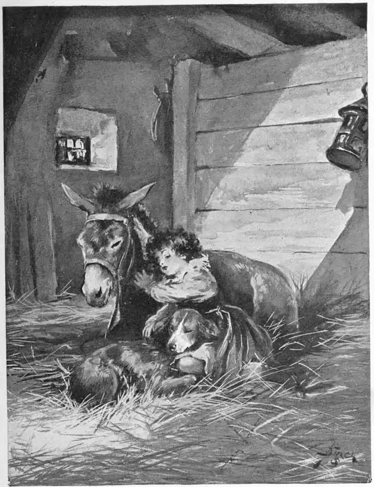 When they came he had been put into queer little trousers, which were much too big for him. One of his brothers had outgrown them and given them good wear. They were, in fact, as ragged as they were big, and as dirty as they were ragged; but Piccino was very proud of them. He went and showed them to the donkey, whose tumble-down sleeping apartment was next to his own, and who was his favorite playmate and companion. It was such a little donkey, but such a good one! It could carry a burden almost as big as its stable, and it had soft, furry ears and soft, furry sides, and eyes and eyelashes as pretty for a donkey as Piccino’s were for a boy. It was nearly always at work, but when it was at home Piccino was nearly always with it. On wet and cold days he stayed with it in its tiny, broken stable, playing[Pg 12] and talking to it; and many a day he had fallen asleep with his curly head on its warm little fuzzy side. When it was fine they strolled about together and were companions, the donkey cropping the grass and Piccino pretending it was a little flock of sheep, and that he was big enough to be a shepherd. In the middle of the night he used to like to waken and hear it move and make little sounds. It was so close to him that he felt as if they slept together.