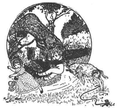 Then he made a sudden rush at them. Effie in her fright, nearly flew towards the gate, dropping her eggs on the way. Poor Tom, however, did not escape so easily. The goat butted him into the air and soon the poor little fellow lay sprawling on the ground.