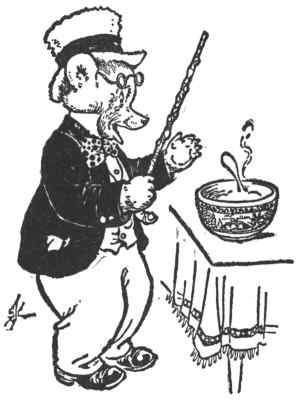 Then little Master Bear tossed his butterfly net into the corner and ran to the table, but though he tipped up his bowl till the pattern was plain to see on the bottom, not so much as one drop of milk could he get from out of it, and he cried in his shrill little voice, “Someone has been at my porridge, and has eaten it all up!”