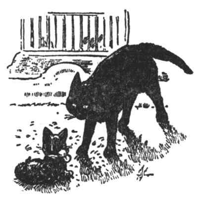 I sprang to my feet and faced Impy. He was a big, black fellow, eight or ten times as big as I was, with eyes flashing like automobile lights. And yet, strange to say, I wasn’t a bit afraid, that is, not after the first startling. I stared at him, put my little back up, and spat at him—real hard! Yes, and I frightened him too, for after a low growl he turned away, scowling at me, and went off to the kitchen to tell Nellie, the maid, all about me. So I lay down to sleep again, and enjoyed a good night’s rest.