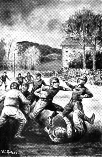 But the visitors braced savagely on the next play, and for a time held their own. Nick and Rooster pierced the line for small gains only, and Knapp was forced to punt. He boomed the ball away to Ford, the Wimbledon quarterback. He caught the ball on his ten-yard line, but succeeded in running it back only three yards before he was downed hard by Bill Sherwood.