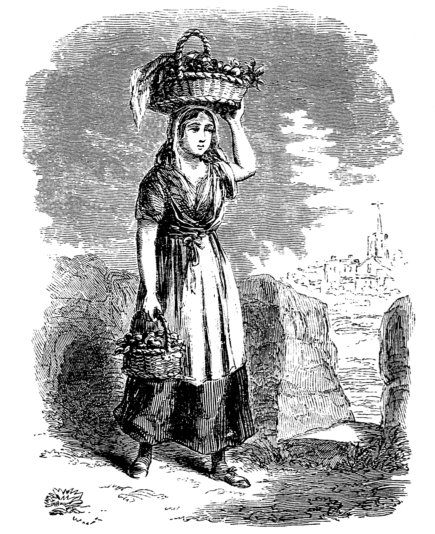 Mary’s scholars thought the muffin-man was very good and kind. There was a picture over the story, and Mary showed them the picture. After they had talked about the poor sailor’s wife, and the little child, and the muffin-man, Carry Deacon asked, “Why the people did not make muffins at home?” Mary told her, “That in large cities, such as Boston, New York and Philadelphia, the 51people who lived there bought many things, which the country people made at home. They bought their milk and their butter and their meat and their eggs, because the houses were built up closely together, and there was not room enough, in towns, to keep cows and pigs and chickens. Mary asked Carry if she had never seen people carrying milk and bread and fruit about, when she was in Philadelphia.” Carry said, “Yes, she had seen a man carrying a bucket with bright hoops around it; and her aunt, at whose house she stayed, told her the bucket had milk in it.” And Carry said, “She saw a woman carrying oranges in a basket, and the woman knocked at people’s doors, and asked them to buy her oranges.”