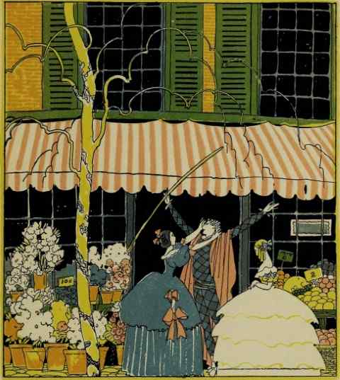 So they turned their steps towards Bergamo, where they arrived after two or three days. As they walked through the streets, Harlequin pointed out to Columbine, who was, of course, very much interested, the scenes of his boyish exploits. When they reached the shop, Harlequin was surprised to see that it was twice as big as it had been when he left it. One half was still filled with fruit, while the other was filled with flowers most tastefully arranged.