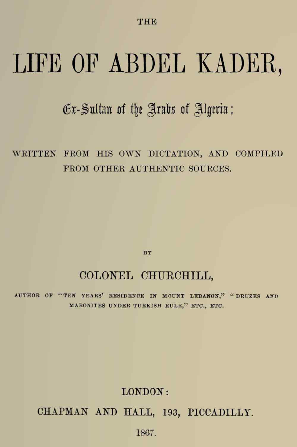 Abdel Kader Nusr-ed-deen, fourth son of Abdel Kader Mehi-ed-deen, was born in the month of May, 1807, at the paternal ketna, or family village, on the banks of the river Hammam. This locality lies in the district of Eghrees, appertaining to the province of Oran, in Algeria.