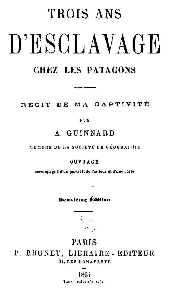 Je n'ai pas, ainsi que tant d'autres, cherché à imiter; je me suis purement et simplement borné à faire la narration scrupuleuse de mes aventures et celle des mœurs et coutumes des Patagons, des Puelches, des Pampas et des Mamuelches avec lesquels, par un enchaînement de circonstances malheureuses, j'ai dû forcément vivre pendant plus de trois ans et demi. La connaissance de leur langage et une longue habitude de leur genre d'existence, m'ayant mis à même de les considérer sous leur véritable point de vue, on pourra prendre pour termes de comparaisons avec tels ou tels écrivains que je m'abstiens de nommer, les diverses observations que j'ai pu faire.