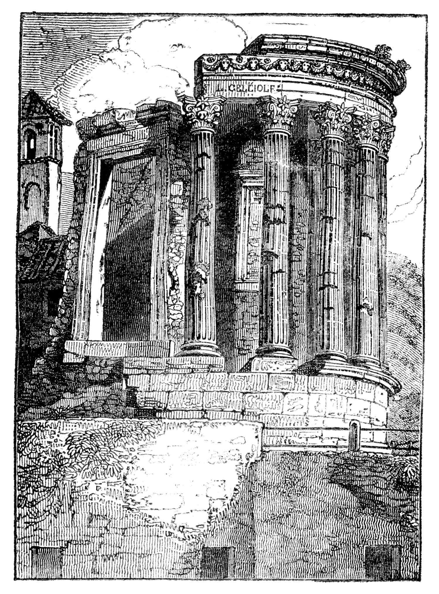 The other temple of Tivoli stands very near to that of the Sibyl, whose name it frequently usurps; but time and man have been less merciful to its beauty. Only four pillars are left, and they are embedded in the walls of a parish church, which is itself abandoned and now becoming a ruin.